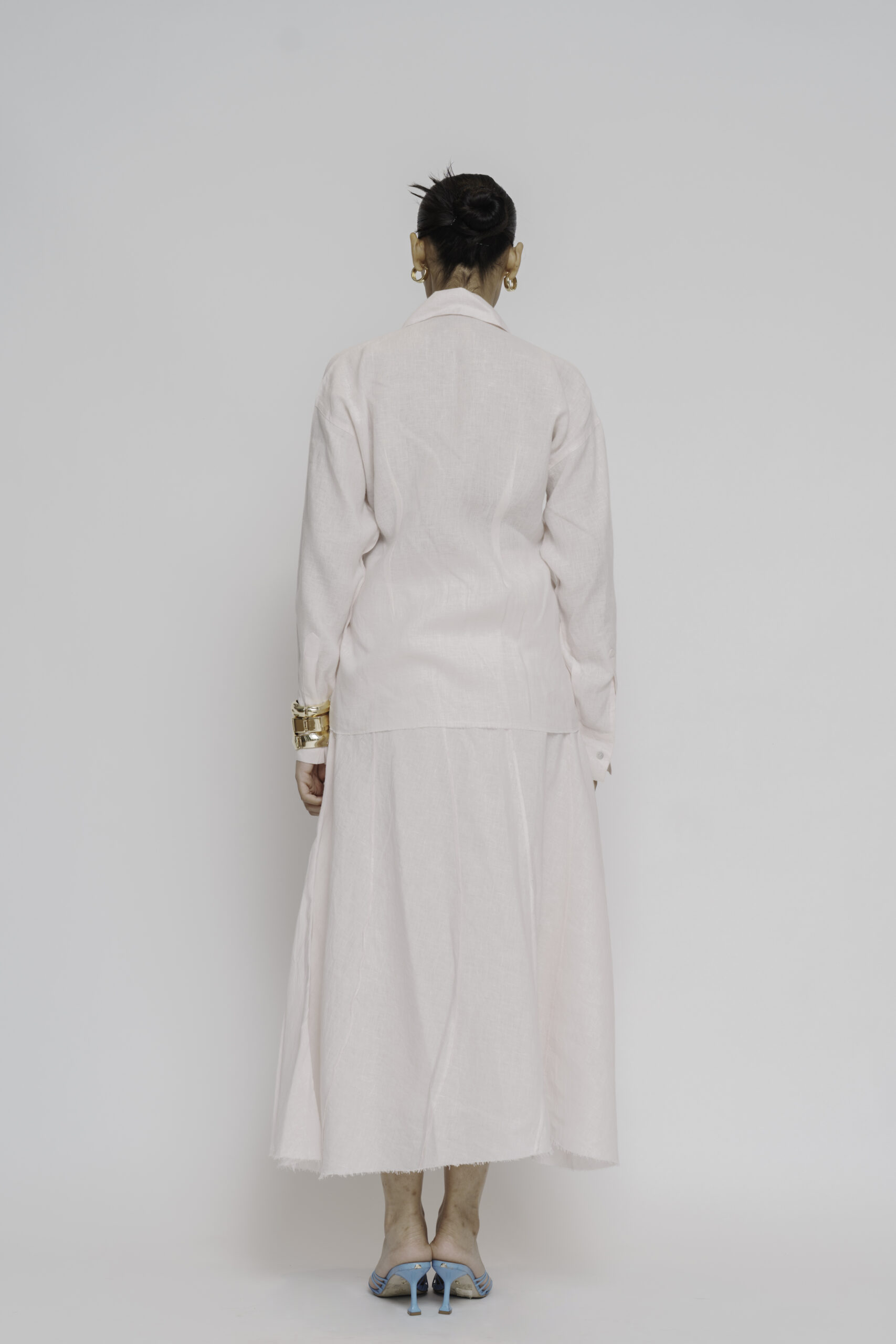 Soft, airy and effortless, this coord set features a lightweight shirt with relaxed fit, pointed collar, overlocking look down the shoulders and a minimal single button detail for a clean finish. Paired with a matching flared maxi skirt designed with overlocking pleats that moves with you.