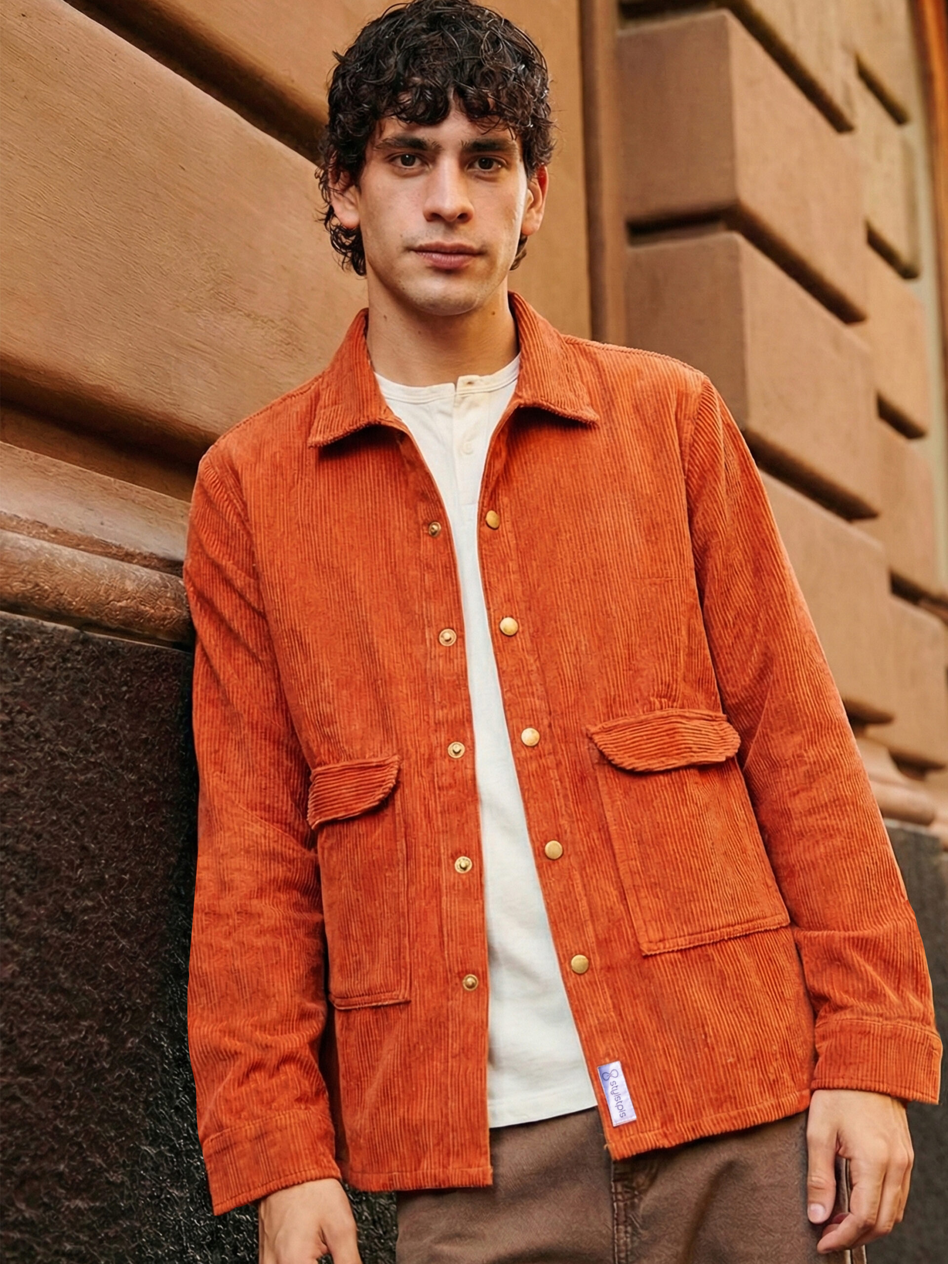 The Stylstpls Rust Orange Shacket is crafted in soft cotton corduroy, bringing depth, warmth, and character to everyday streetwear.