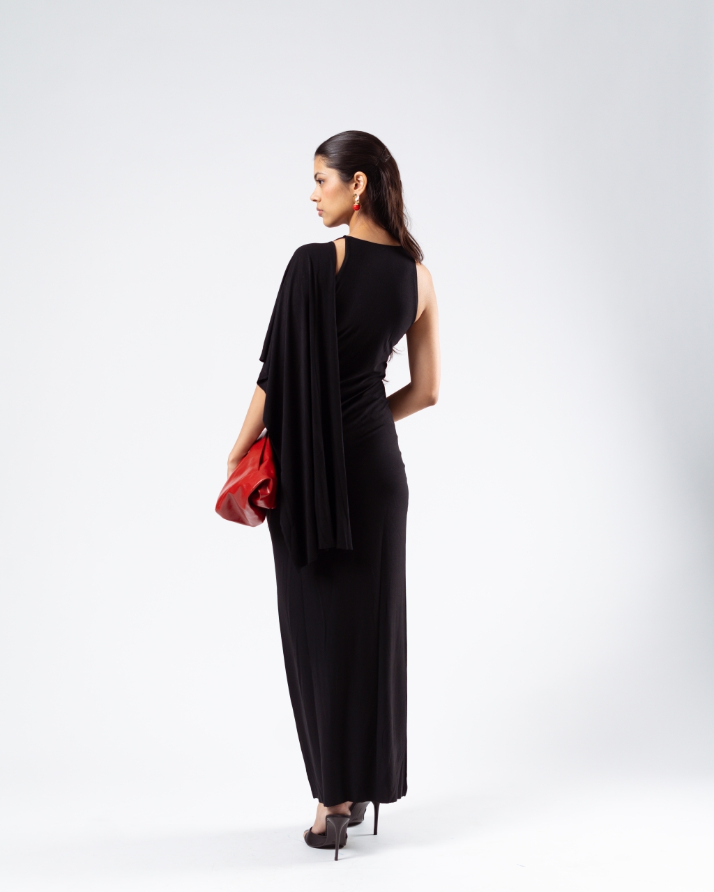 A sleek, body-skimming dress featuring draping on one-shoulder and delicate beadwork along the neckline. Crafted in a fluid fabric, it blends minimal design with subtle embellishment for effortless, understated elegance.