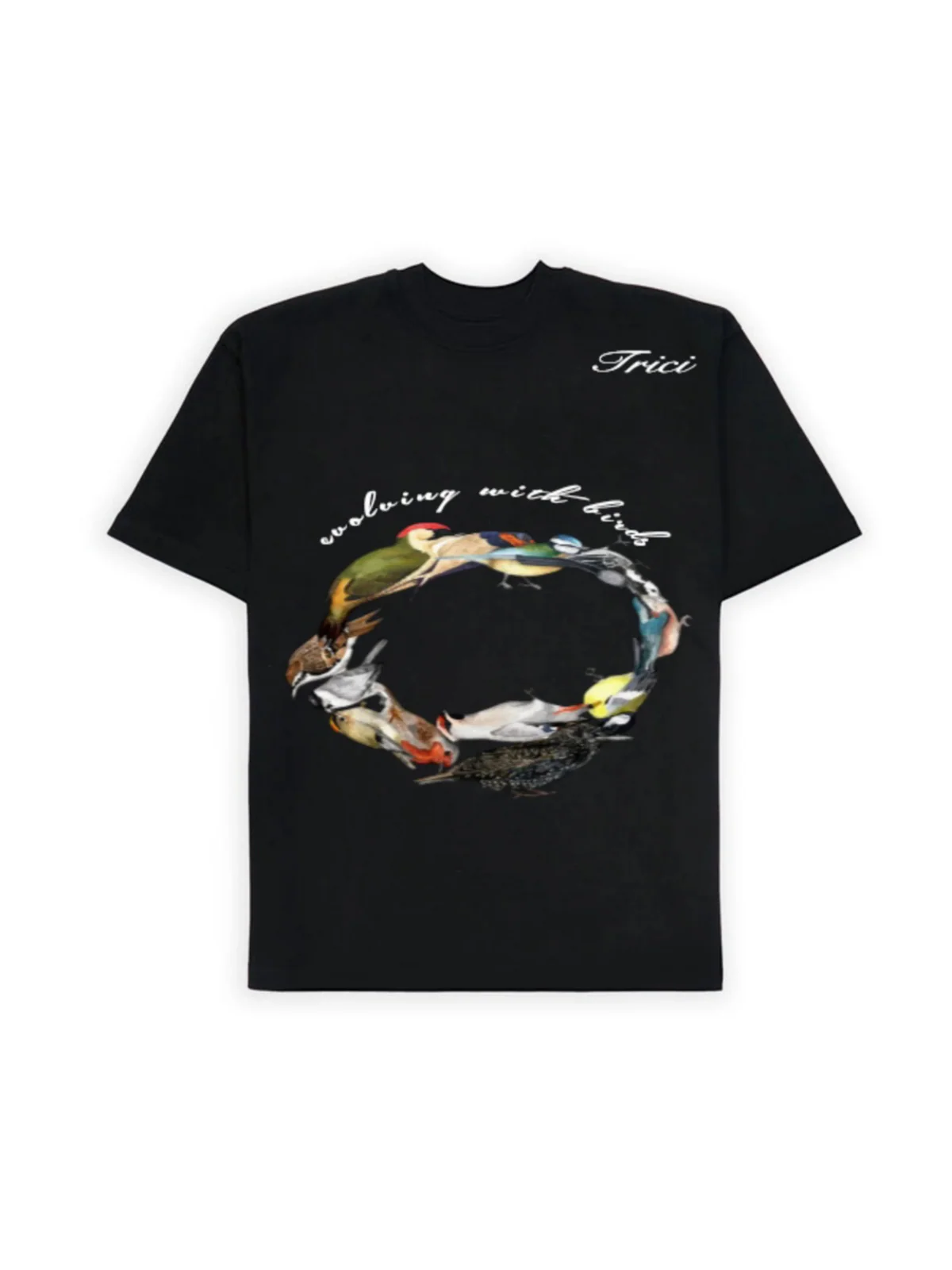 THE ORIGINAL TRICI EVOLVING WITH BIRDS ARTWORK PRINT ON THE FRONT, INSPIRED BY NATURE AND FREEDOM. DESIGNED TO EFFORTLESSLY PAIR WITH YOUR EVERYDAY FITS.