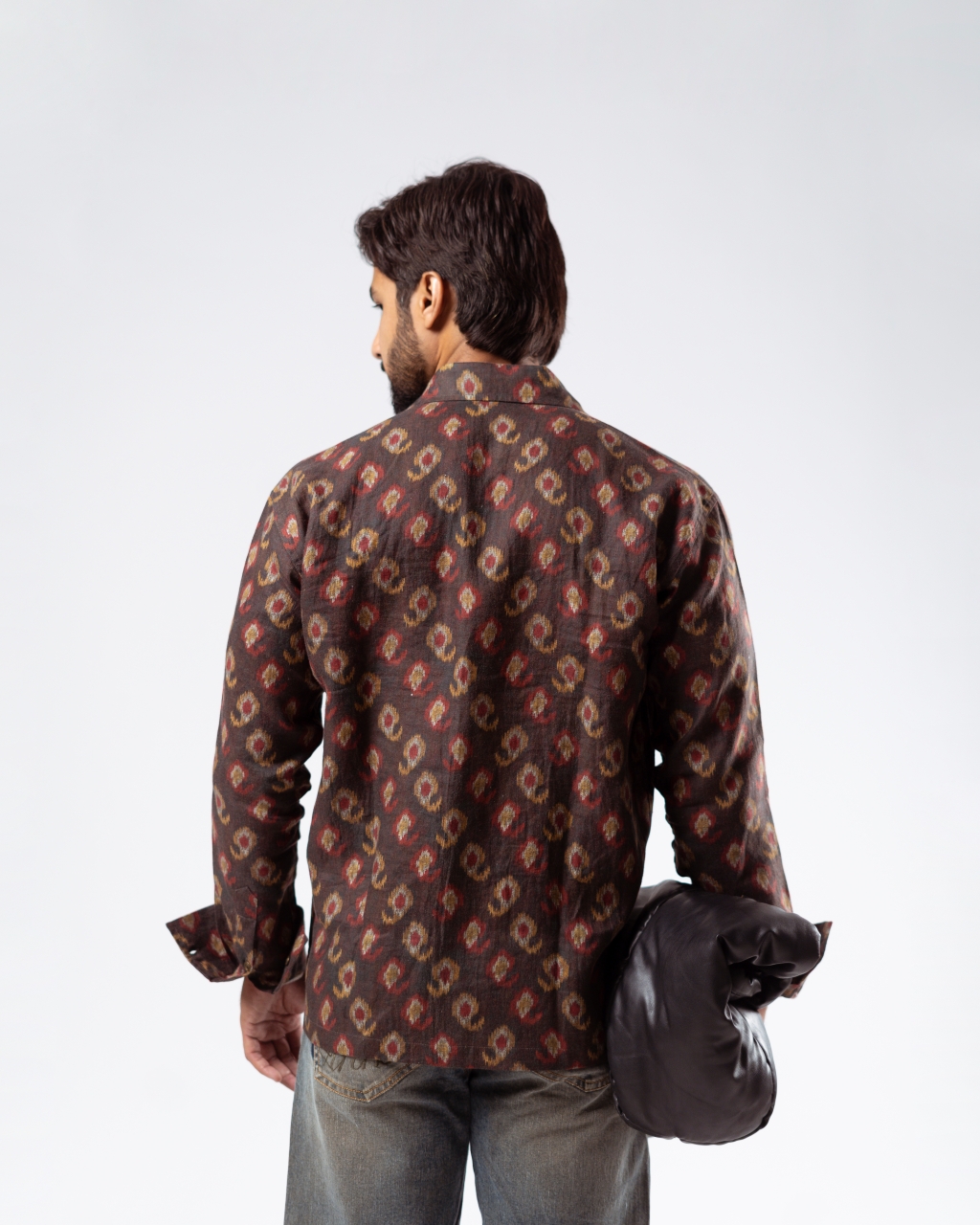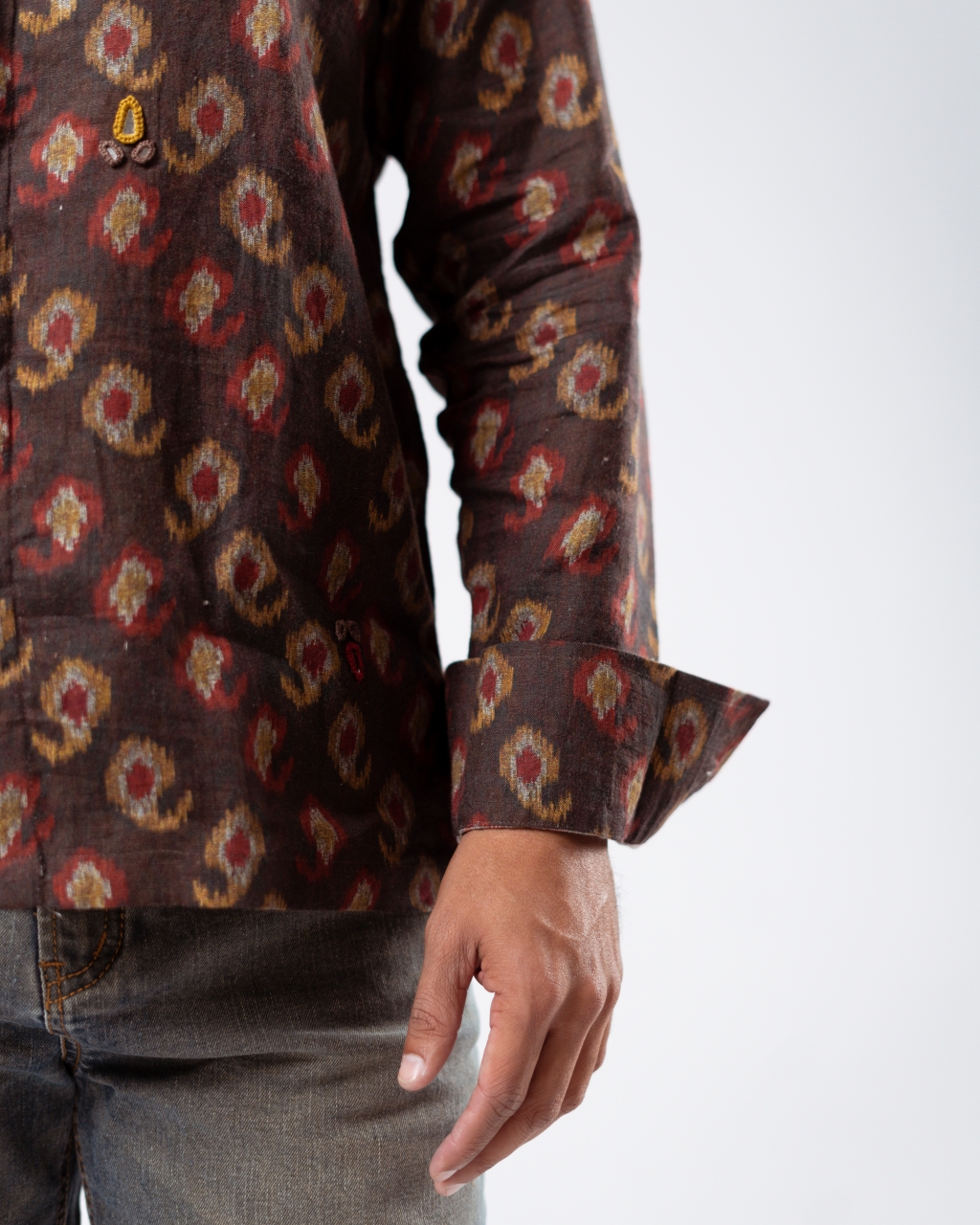 Crafted in a deep earthy base, this shirt features an all-over ikat-inspired motif in warm rust and muted gold tones. The relaxed silhouette, sharp collar and clean placket keep it contemporary, while the subtle hand mirror embroidered accents add depth and character