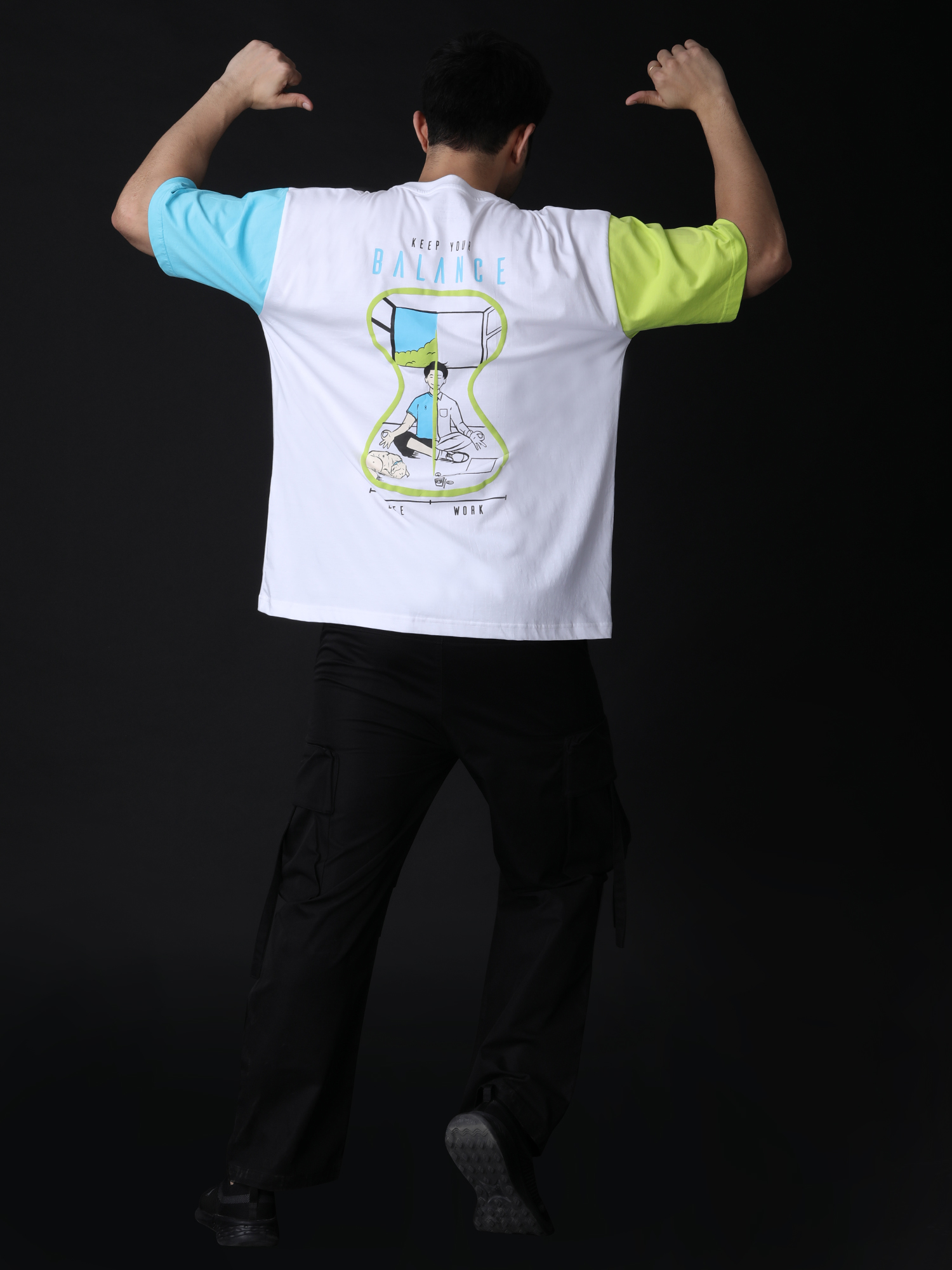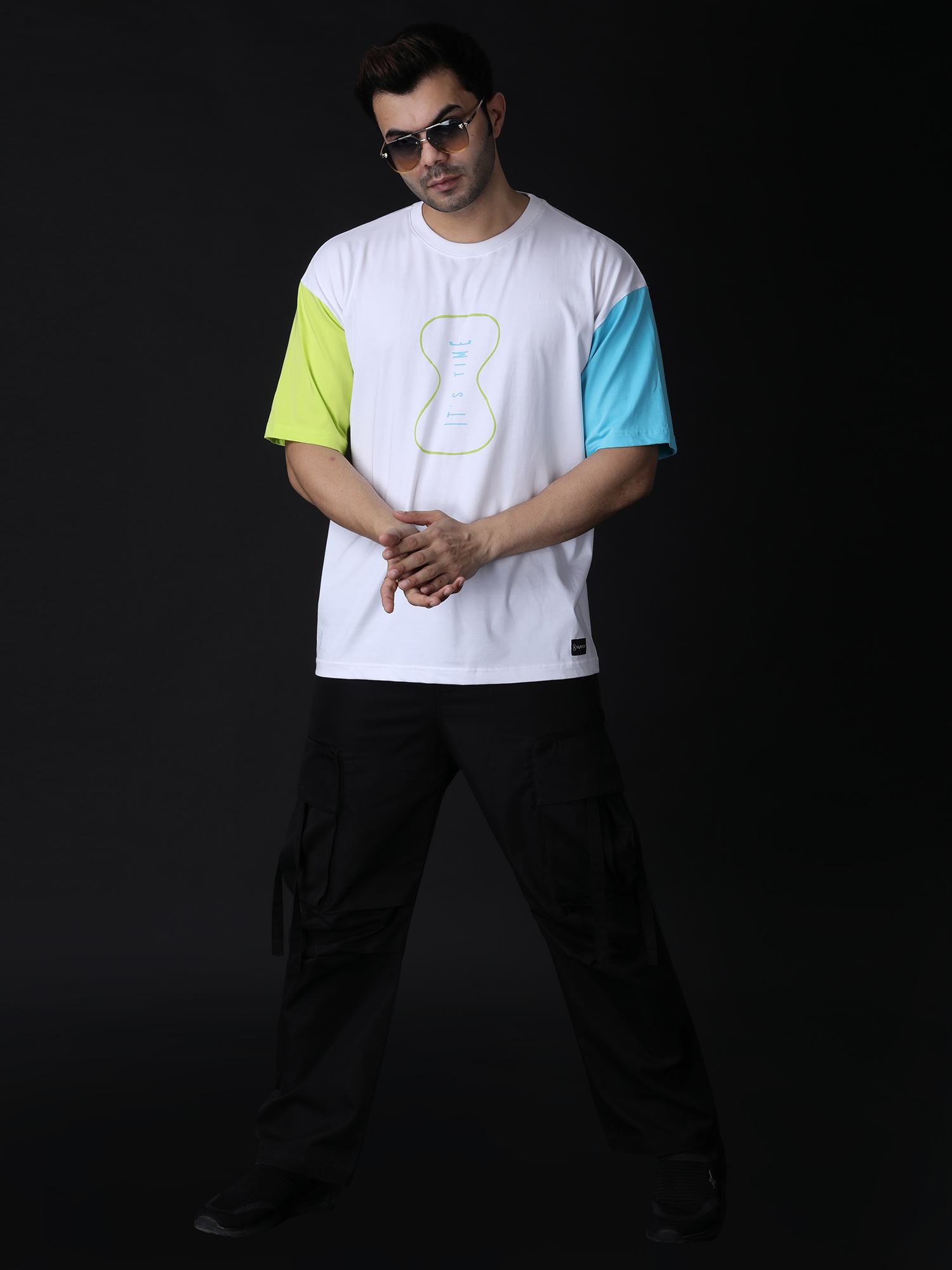 Featuring a striking hourglass print and the motivational quote “IT’S TIME,” this streetwear graphic tee channels modern minimalism. The lime green and aqua blue sleeves add a playful edge to the clean white base, making it perfect for urban casual wear. Finished with a subtle woven logo tag, this fashion-forward oversized tee pairs effortlessly with joggers, jeans, or shorts for standout street style.
