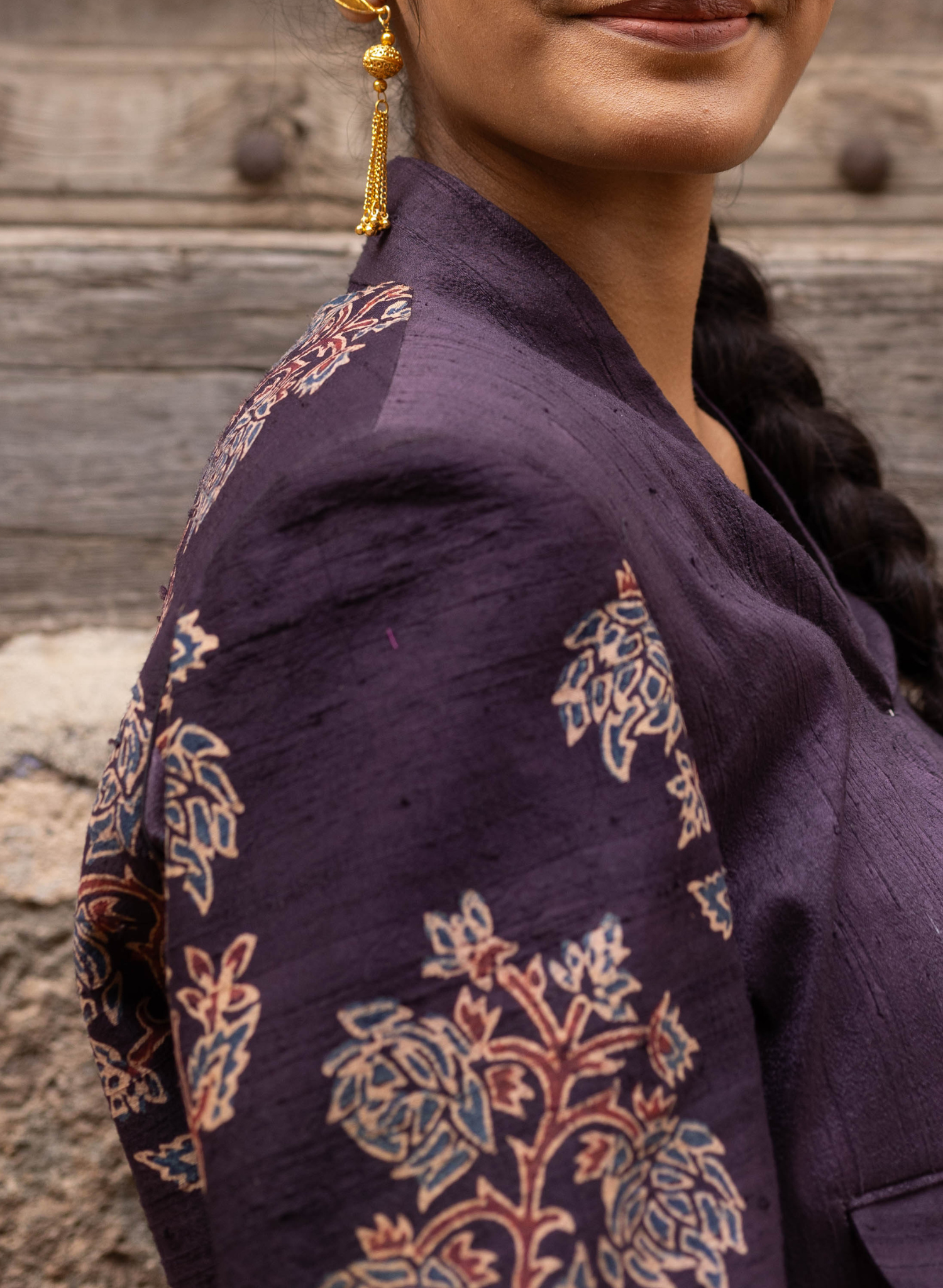 Oversized crop jacket made from 100 gm handwoven raw silk. Features Ajrakh hand block prints, black piping, and metallic buttons.