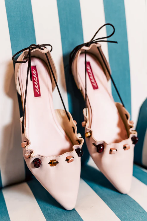 A warm pink leather handcrafted flat finished with hand-strung glossy beads and ruffled edging.
