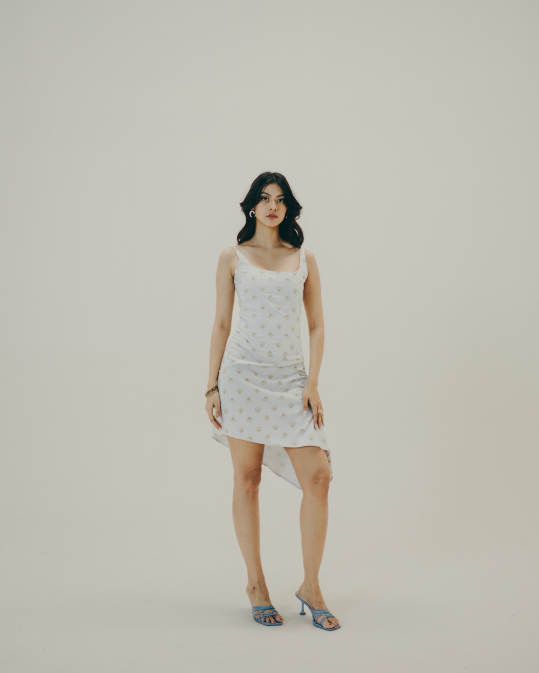 Crafted from lightweight fabric, it features a soft drape that contours effortlessly to the body. The dress is adorned with subtle motifs. A gently ruched side seam enhances the fit, while the asymmetrical hemline brings a modern, fluid silhouette.