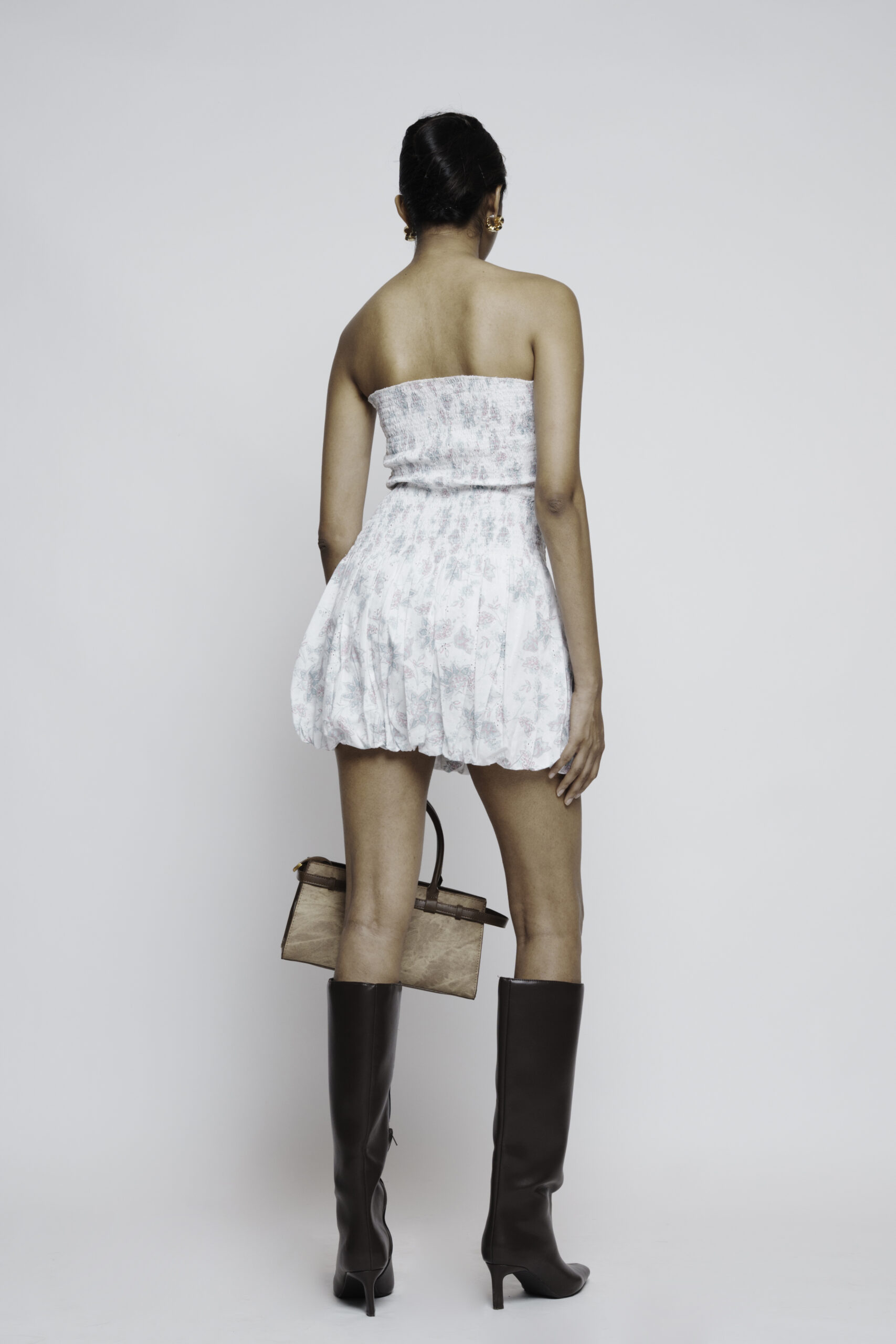 A strapless mini dress is a breezy summer essential, featuring an all-over soft floral print & a flattering smocked bodice that hugs the body comfortably. The silhouette flares into a playful balloon hem, giving a charm & added volume.