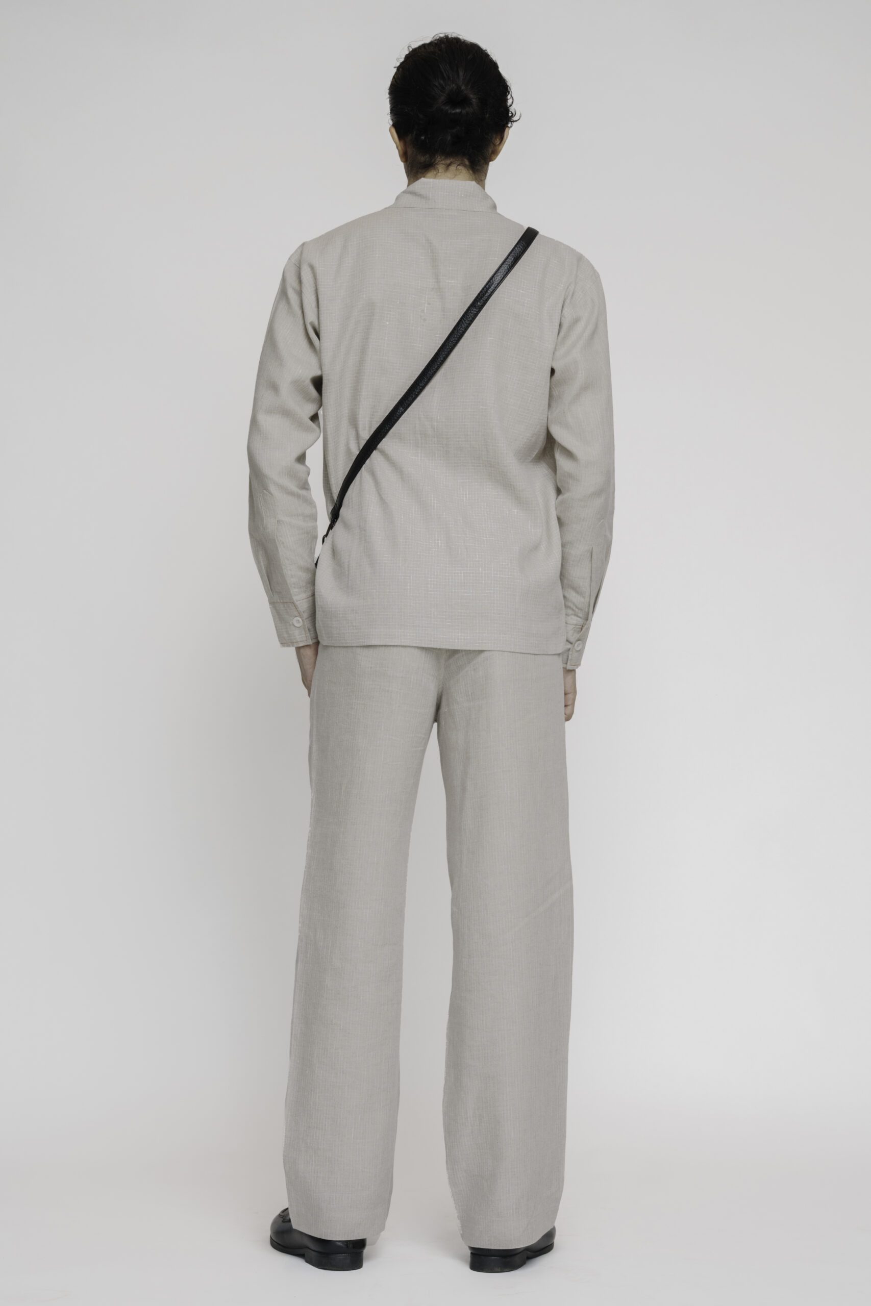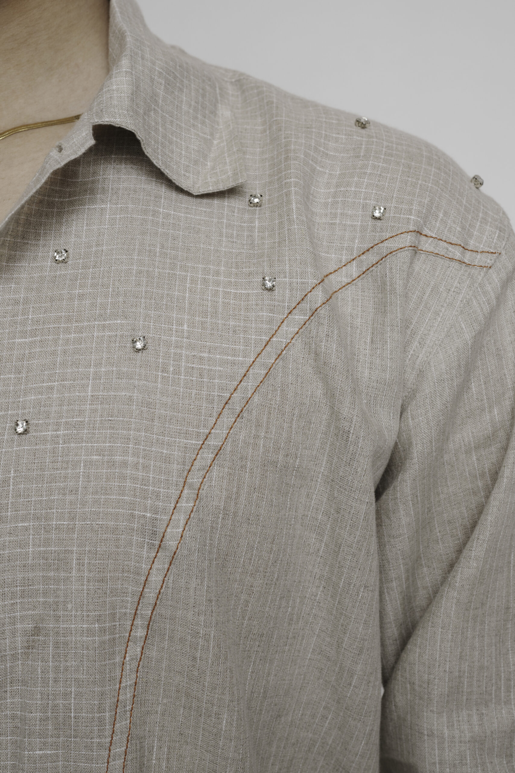 Crafted in linen, this beige shirt is definition of understated luxury. The shirt features clean button down tailoring with subtle contrast topstitching that arches across the chest and cuffs, adorned with delicate stone embellishments.