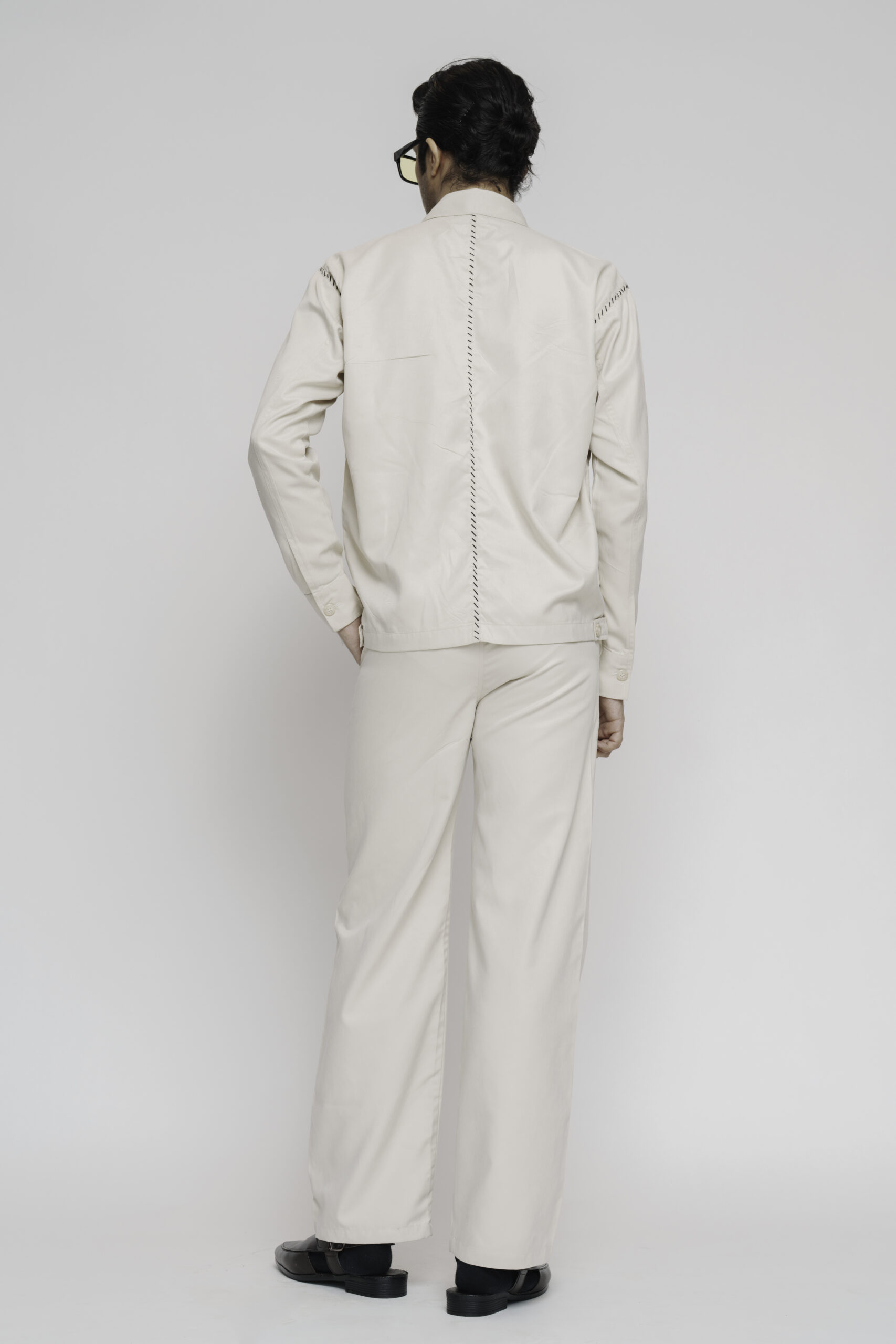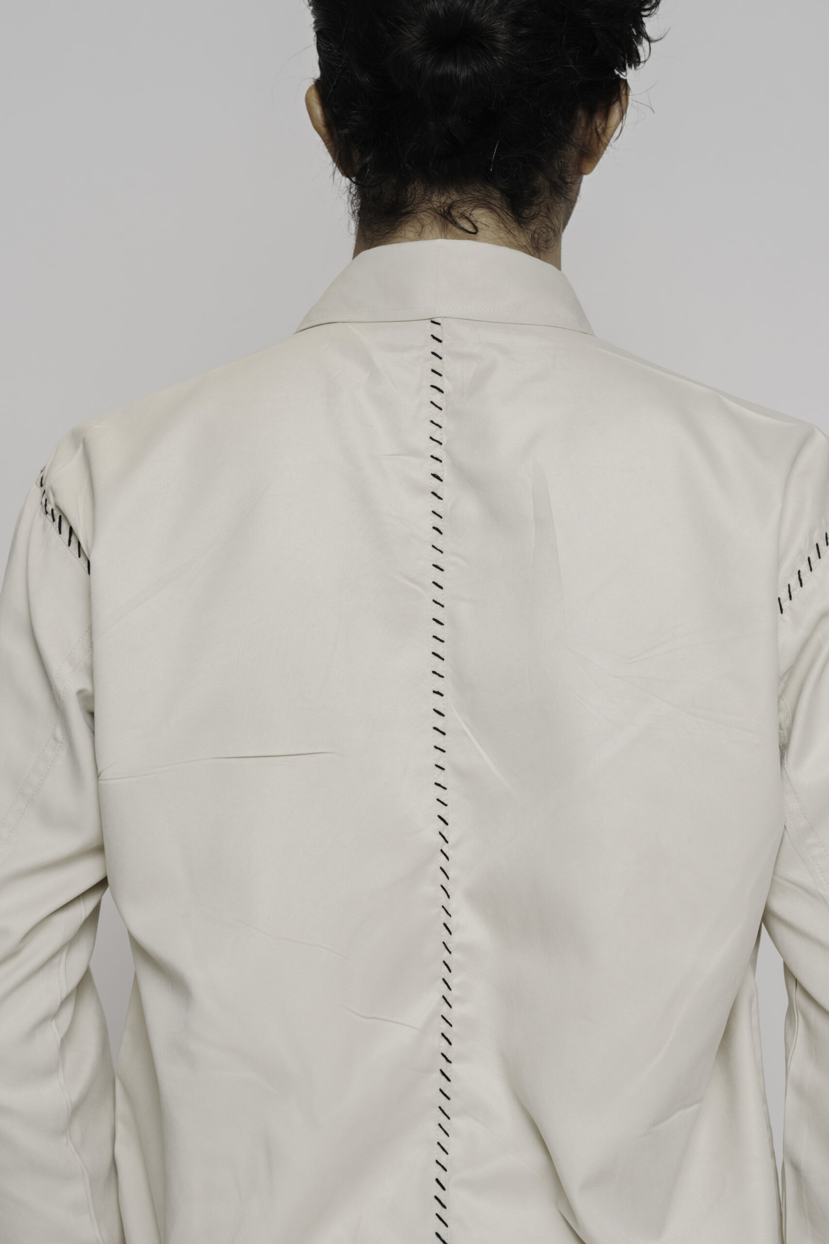 Effortlessly cool and quietly bold. This full sleeve shacket is tailored for ease and every day polish. This piece is elevated with contrast colour hand stitch running across chest, shoulders and back . Side welt pockets bring both function and structure.