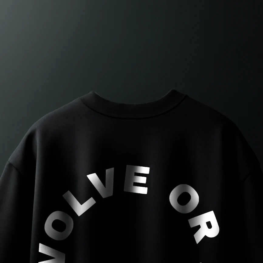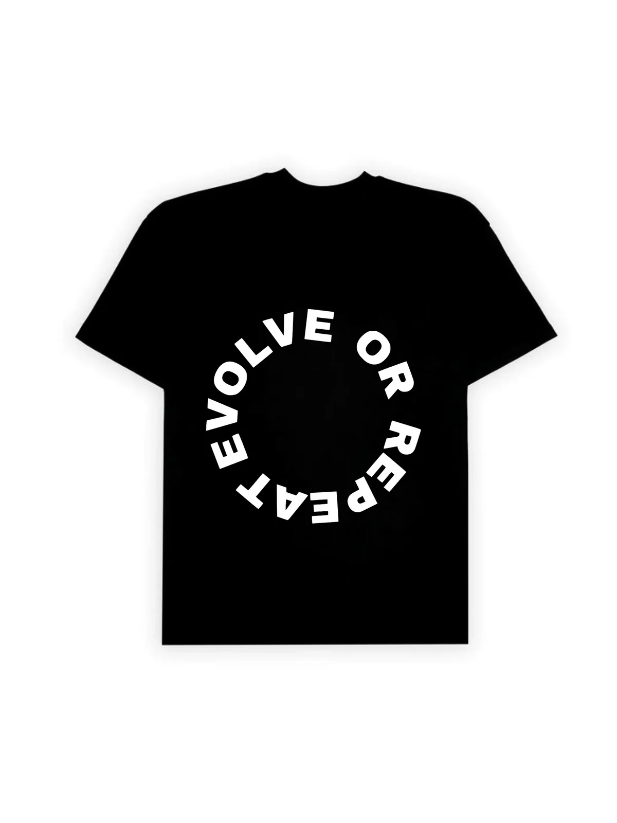 Bold ‘EVOLVE OR REPEAT’ circular tagline print on the back
