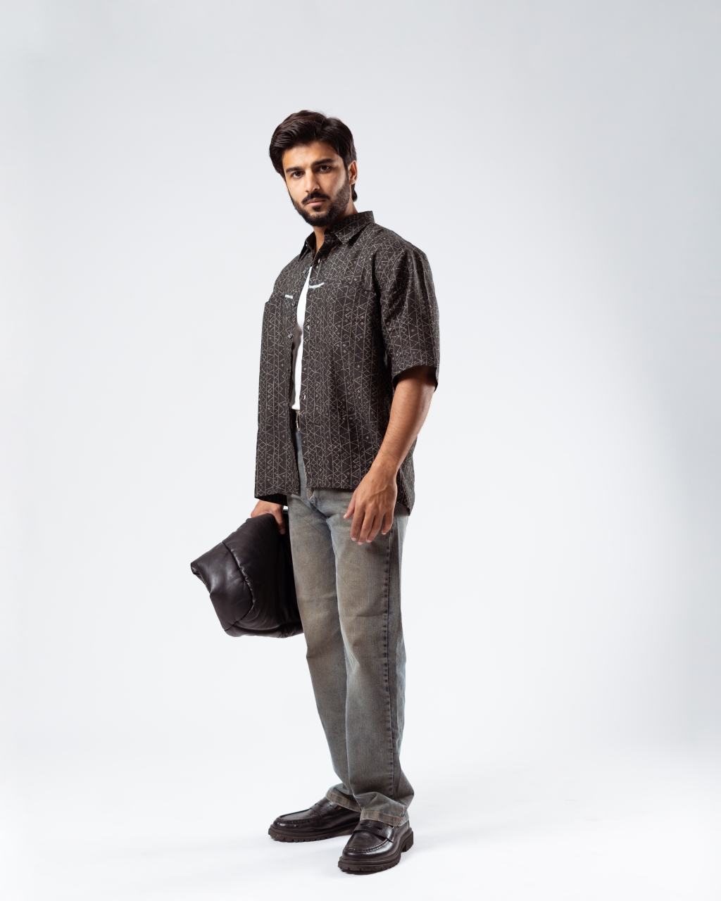 A relaxed-fit half sleeve shirt crafted in a pure linen fabric featuring an all-over geometric like print. Finished with subtle hand-stitch detailing along the yoke, adding an artisanal touch to a timeless silhouette. Easy, breathable, and designed for effortless everyday wear.