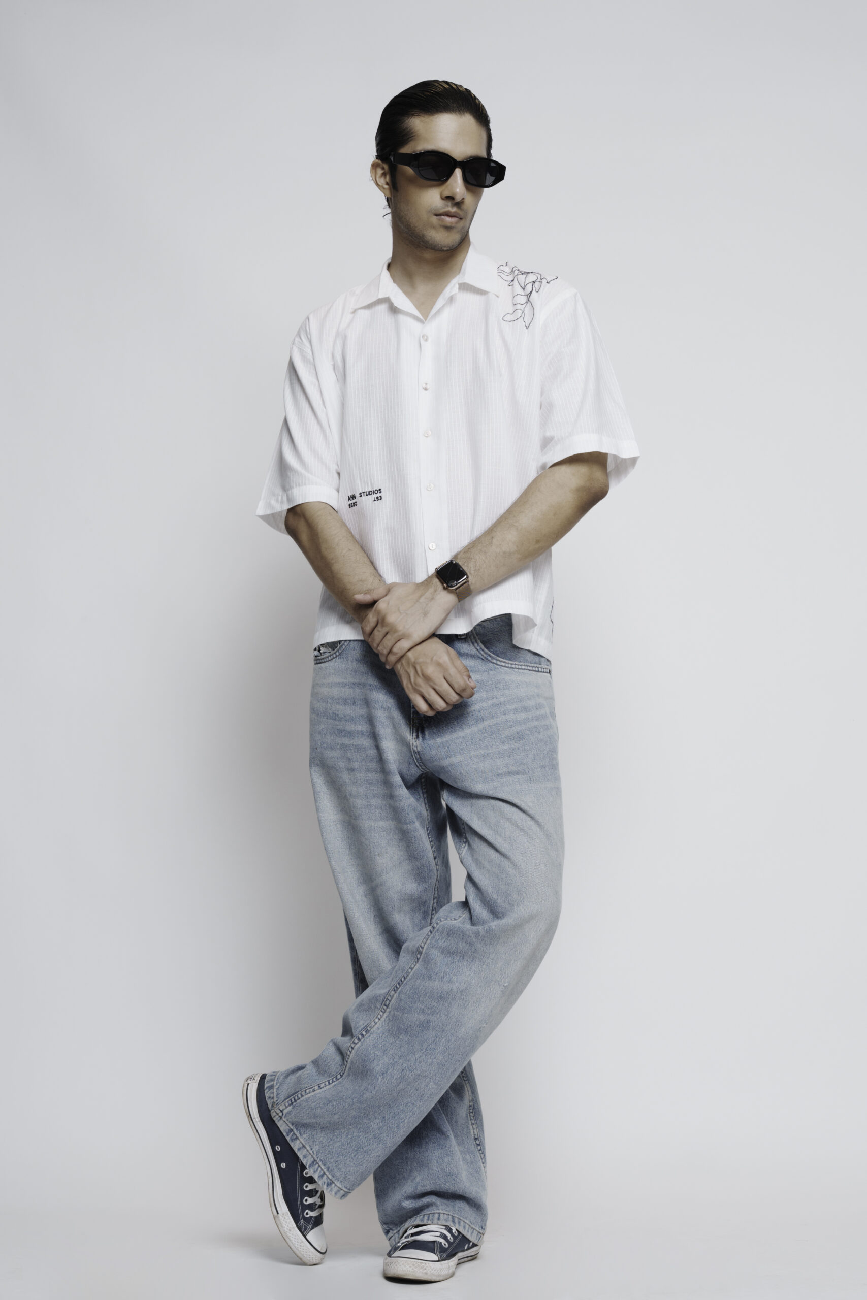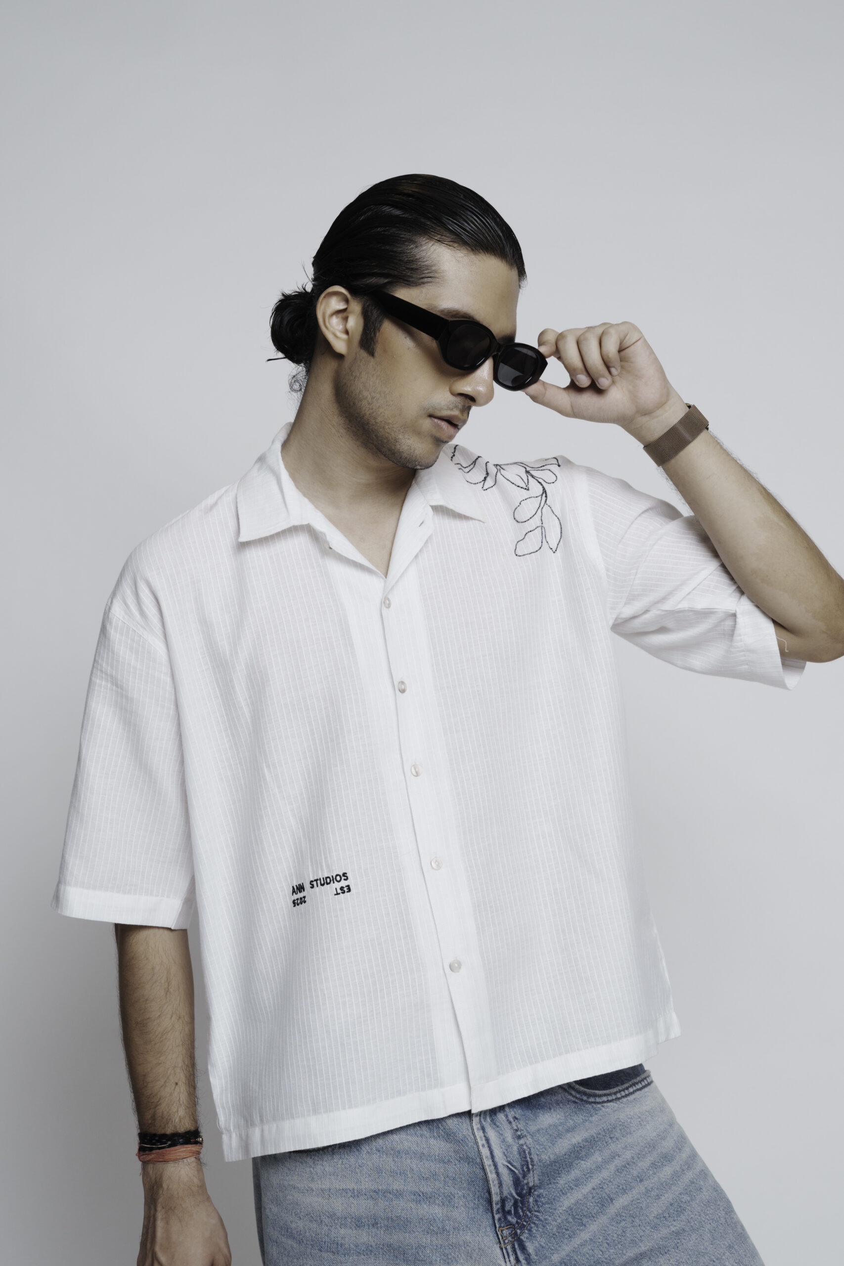 Lightweight, breathable perfect for sunny days. This white short sleeve shirt is crafted with contrast embroidery all over randomly on the shirt featuring a clean Ann Studios mark keeping it fresh & elevated.